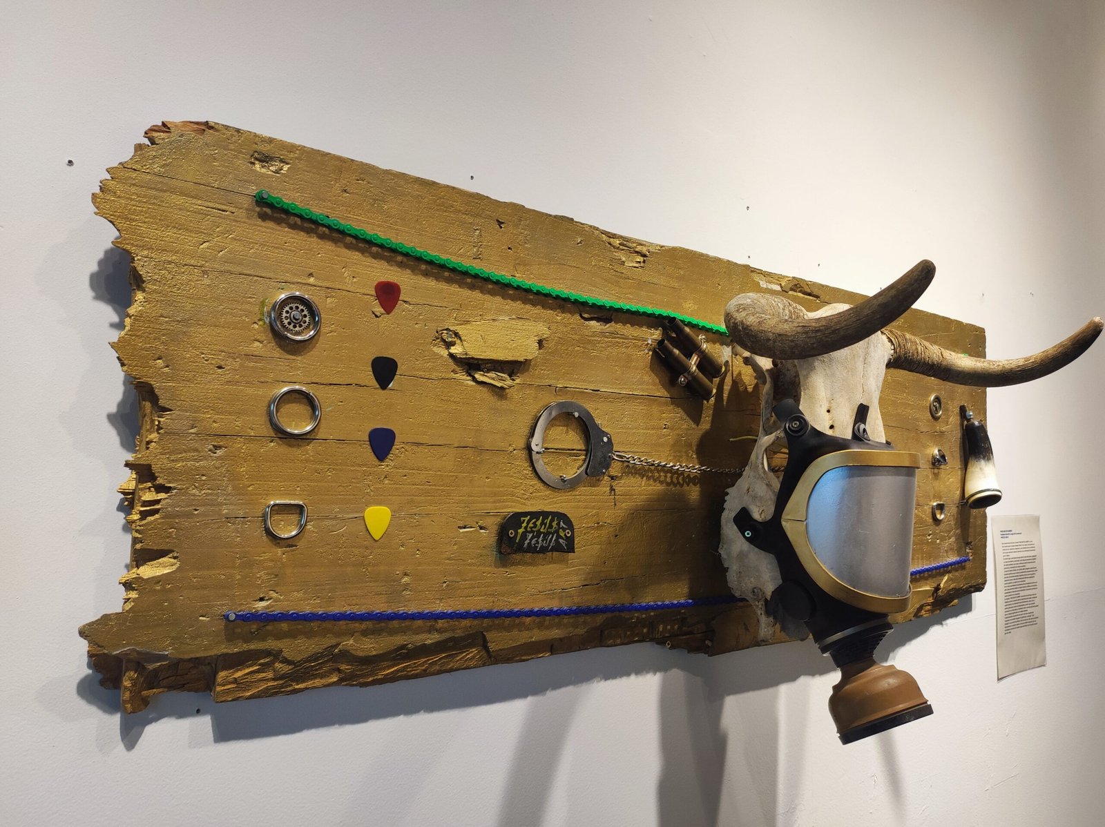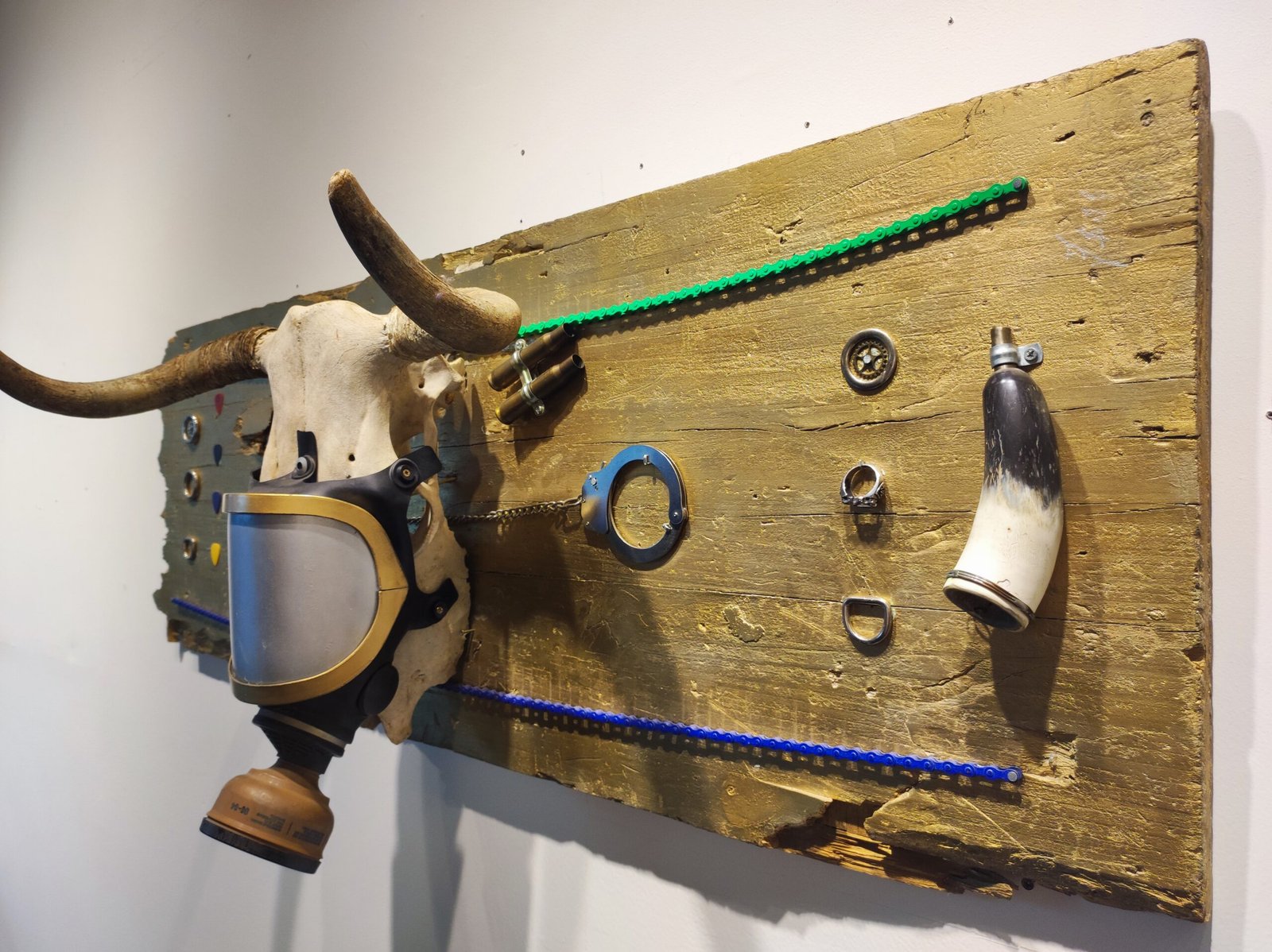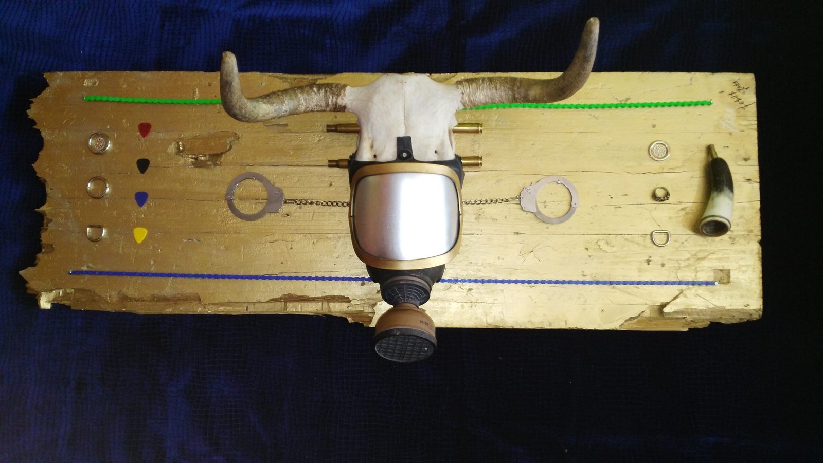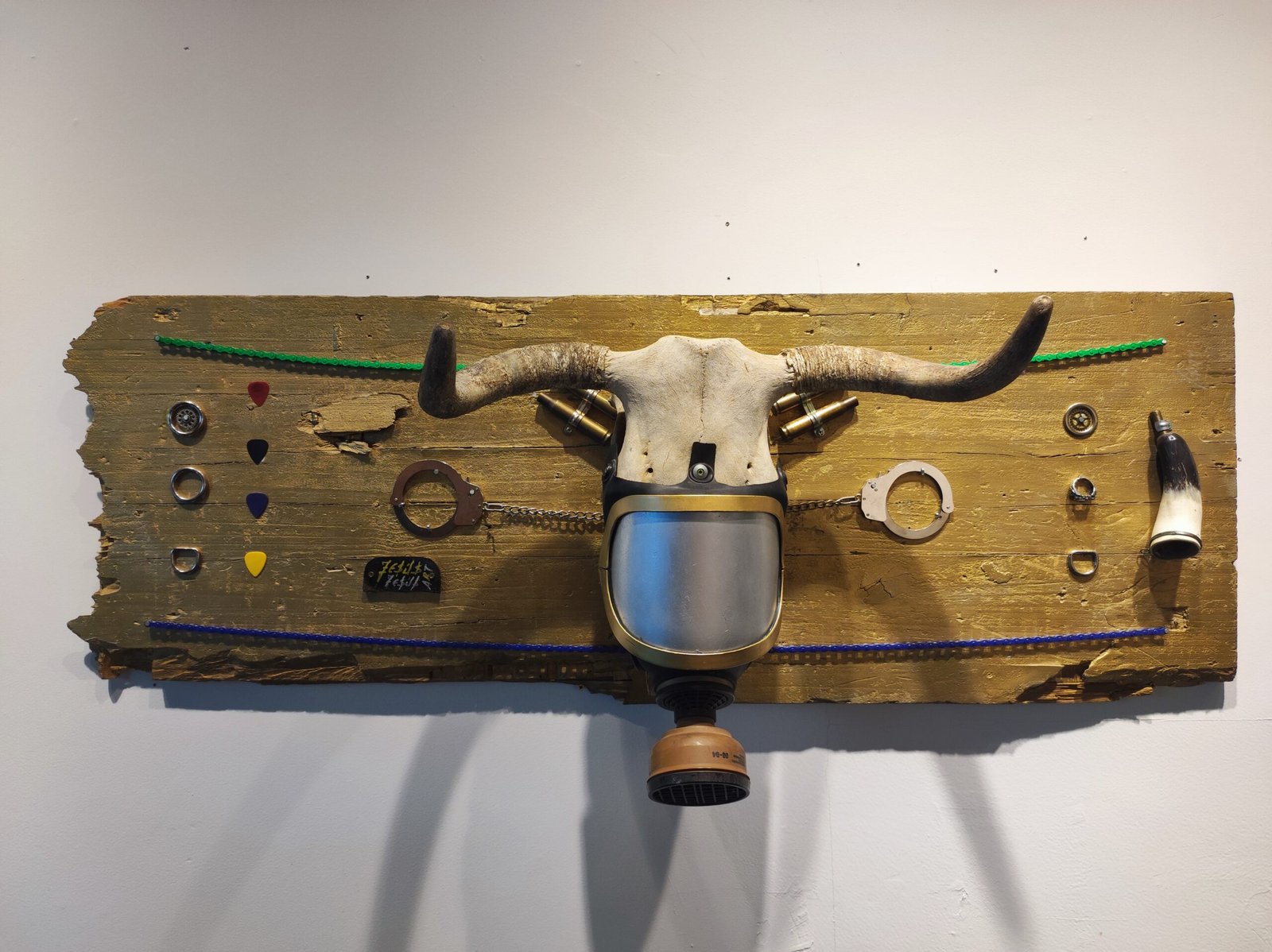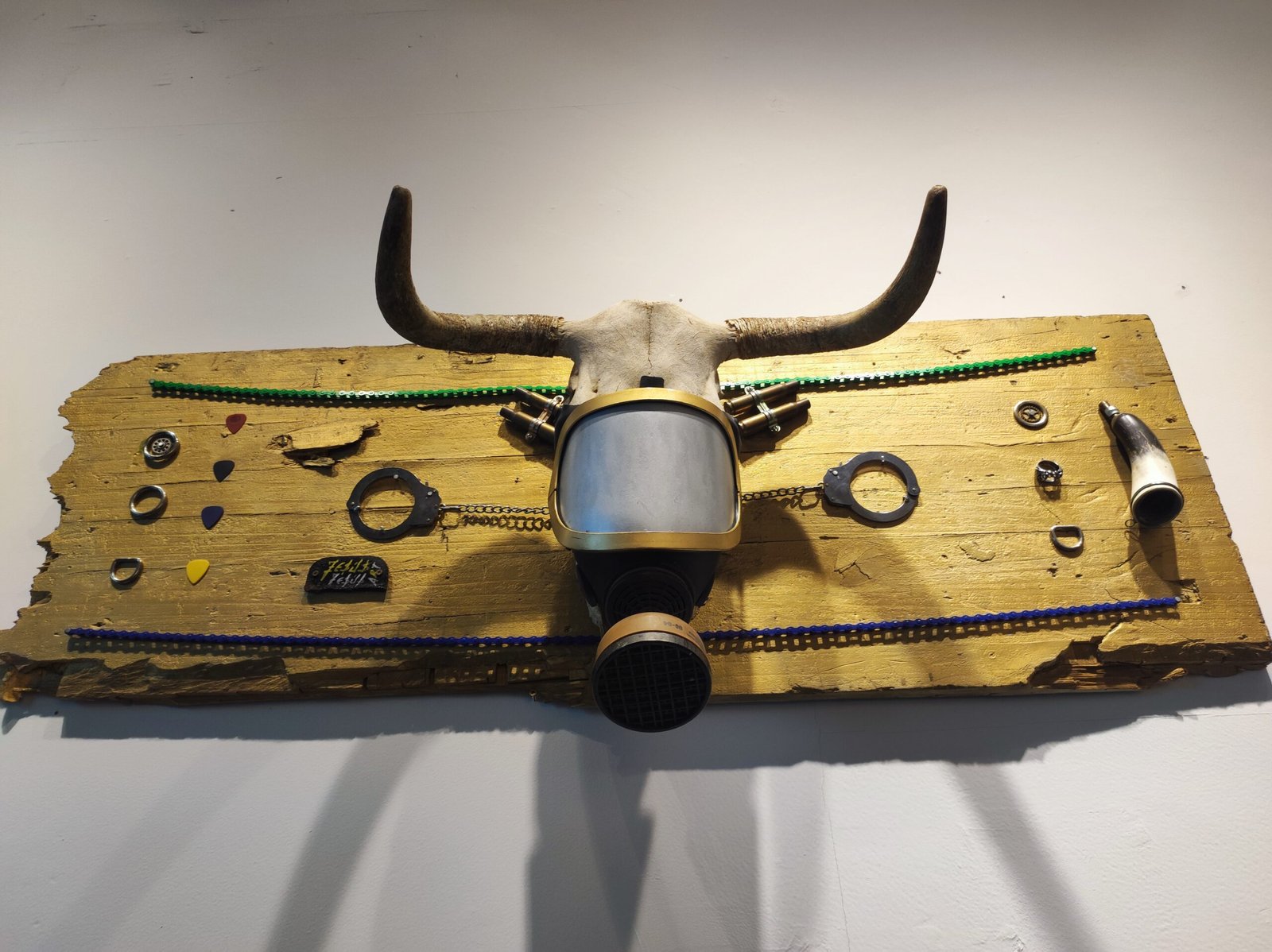 Soporte: Cráneo de Toro, Máscara de Gas y Madera Dorada.