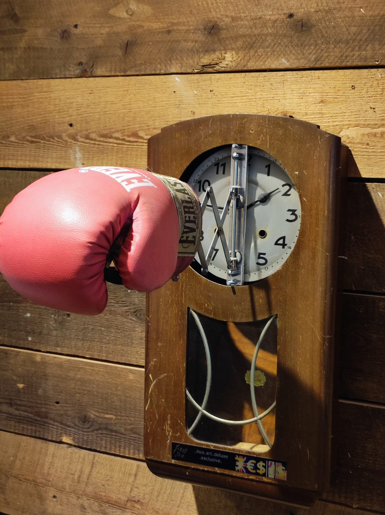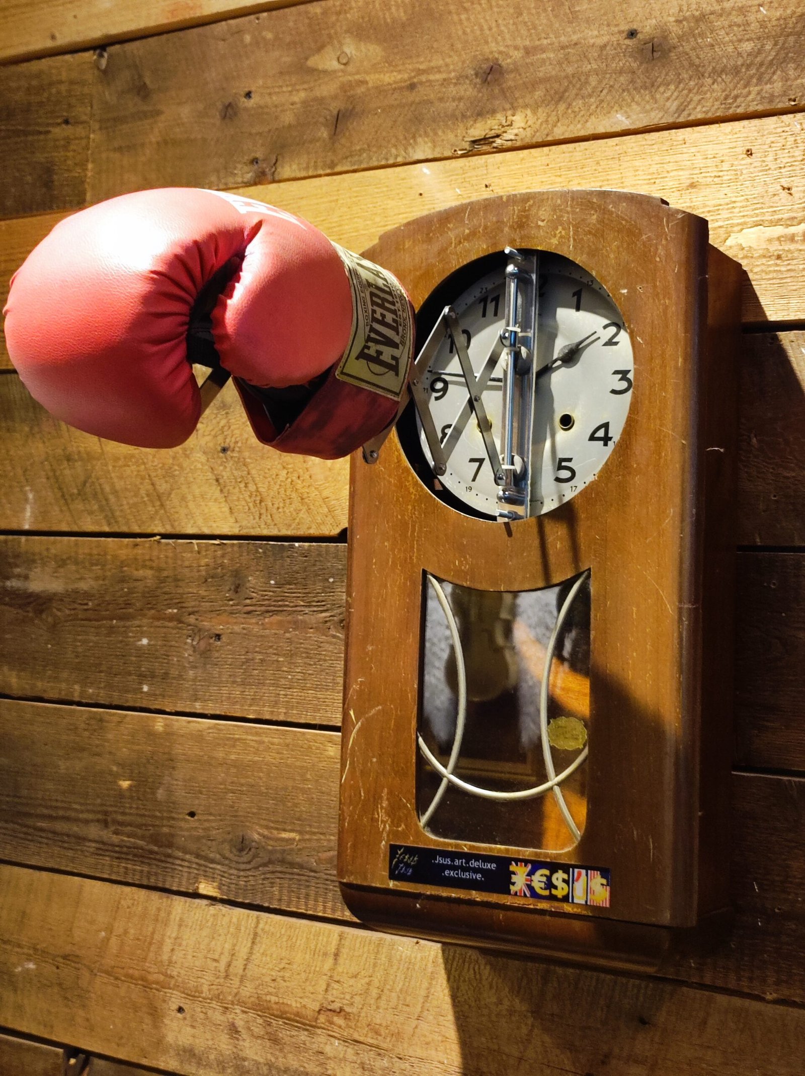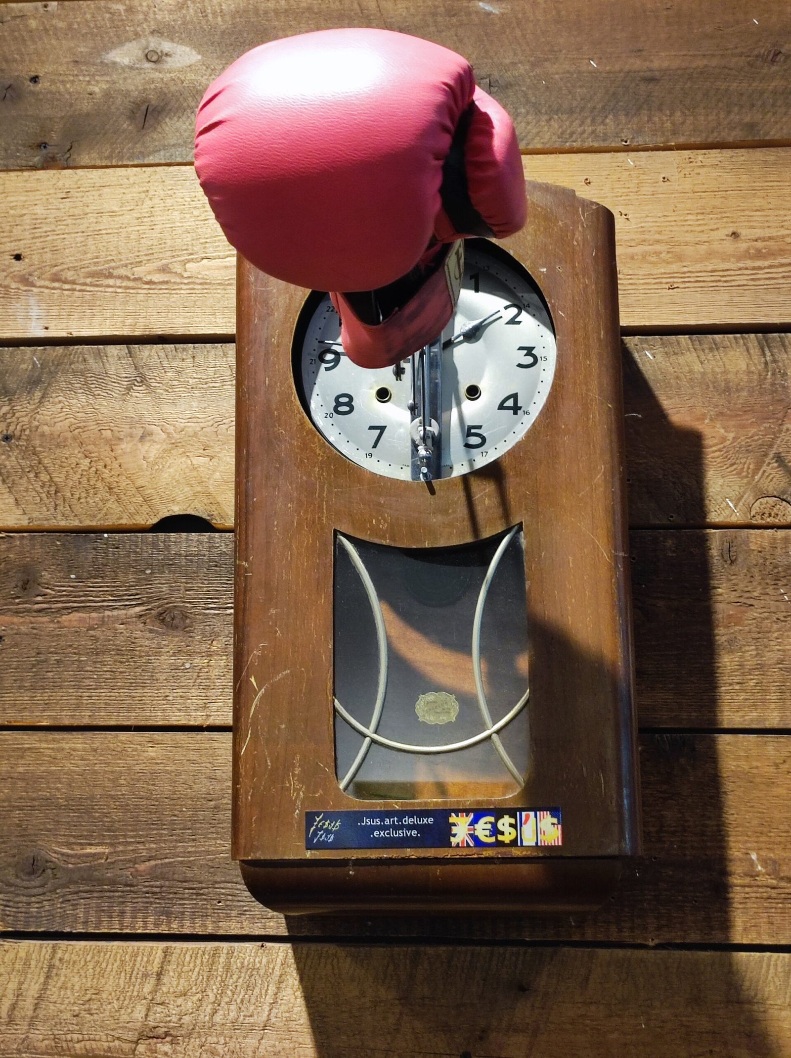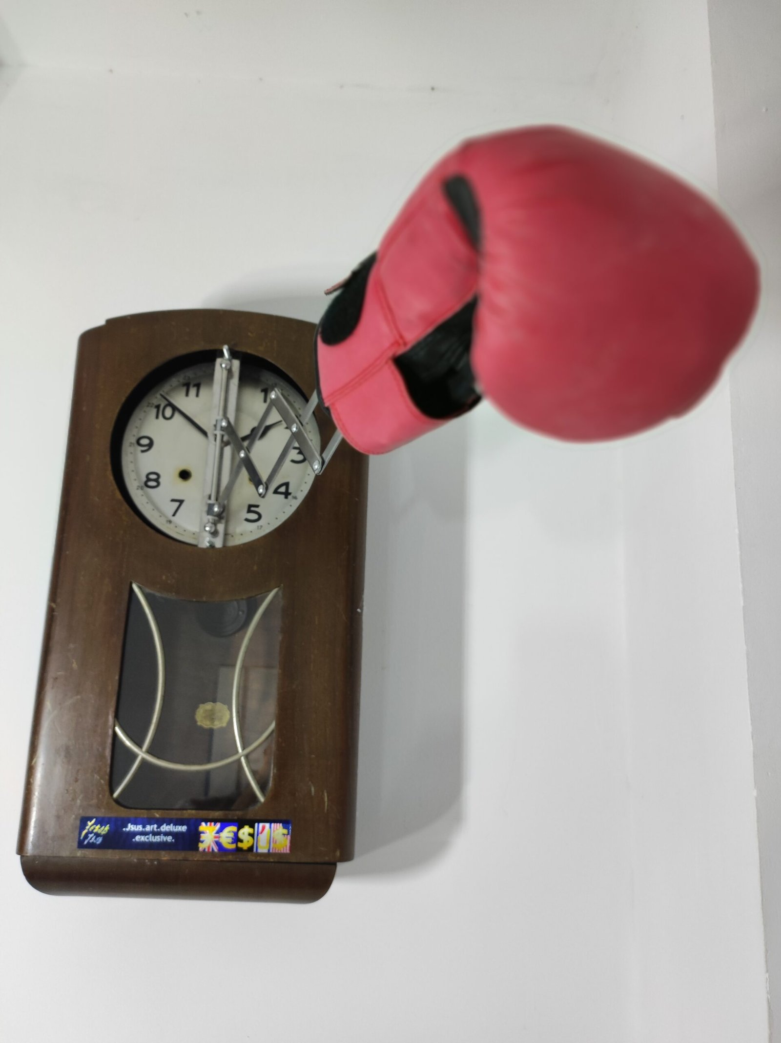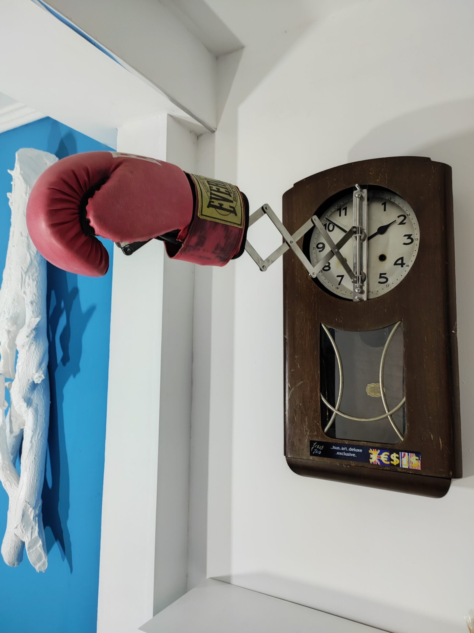 Tiempo Golpea de JSUS ART DELUXE no es una escultura convencional. Es un manifiesto visual sobre la lucha eterna contra el tiempo, una pieza 1/1 que transforma un reloj intervenido y un guante de boxeo en arte de culto. Esta obra de arte objeto redefine los límites de la creatividad mediante una intervención audaz sobre iconos del tiempo y la resistencia.