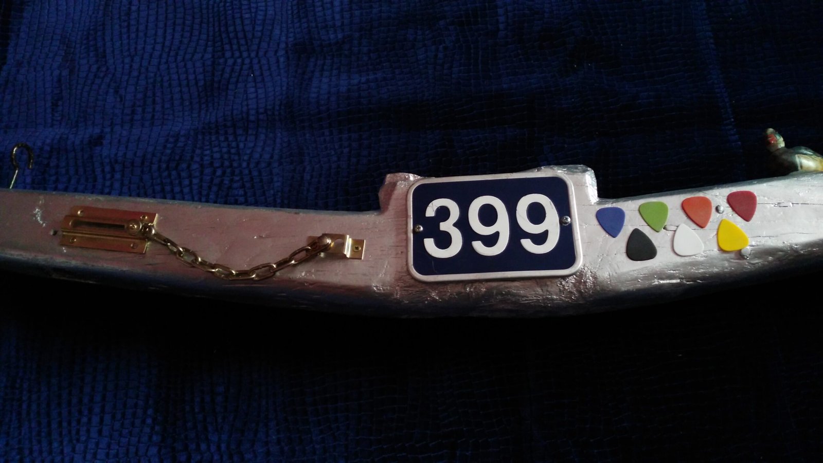 Soporte Yugo intervenido, matrícula de moto, cerrojo, púas de guitarra, pato de madera, esposas